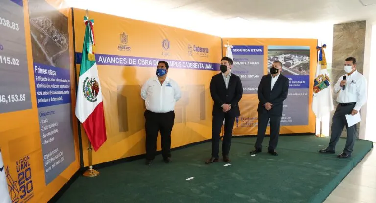 Acompañado por el Rector de la Universidad Autónoma de Nuevo León (UANL), Santos Guzmán López; y el alcalde de Cadereyta, Cosme Julián Leal Cantú, el