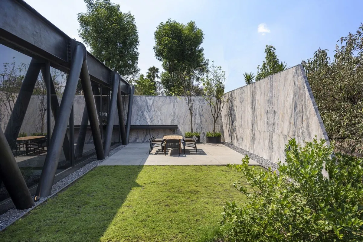 El diseño estructural de la casa se resuelve a partir de una armadura de acero. Libra un volado de 20 metros sobre la barranca. De acuerdo con el taller es para aprovechar la totalidad del terreno.