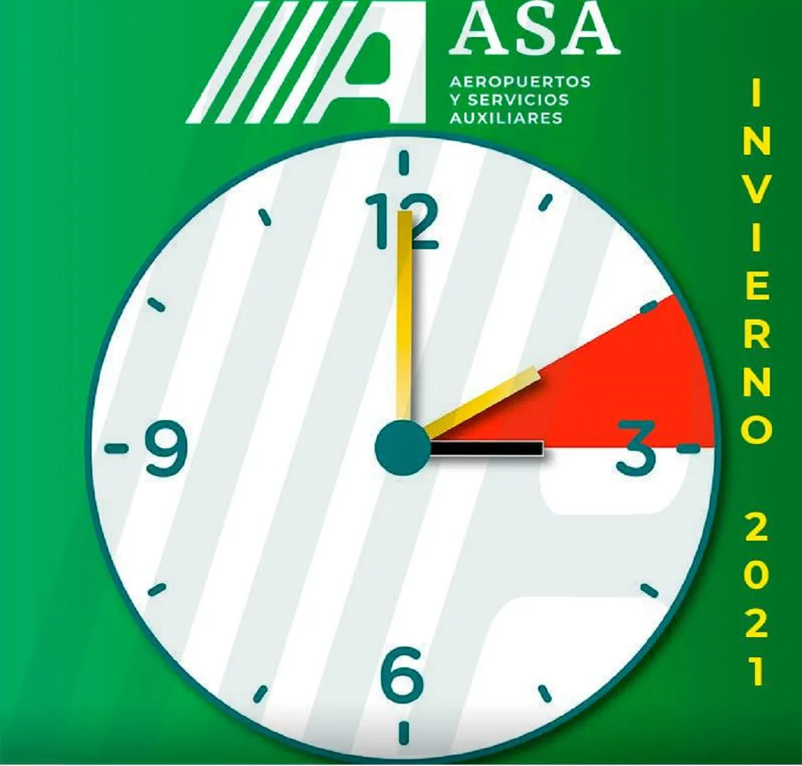 El domingo 31 de octubre, a las 02:00 horas, la Red de Aeropuertos y Servicios Auxiliares (ASA) retrasará una hora los relojes en 13 de sus 19 terminales aéreas, para dar inicio con el Horario de Invierno, mismo que concluirá el domingo 3 de abril de 2022.